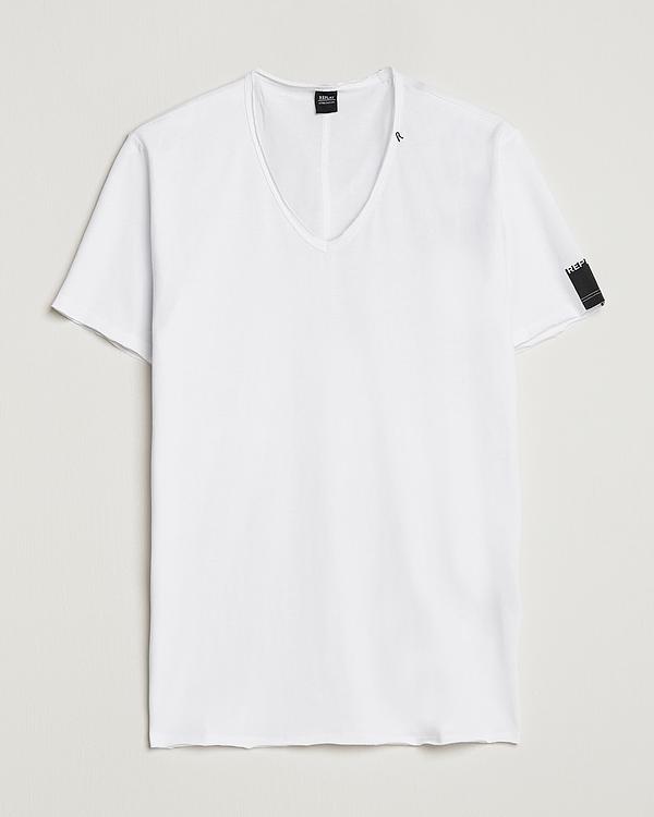 White t-shirt with dark grey chino shorts