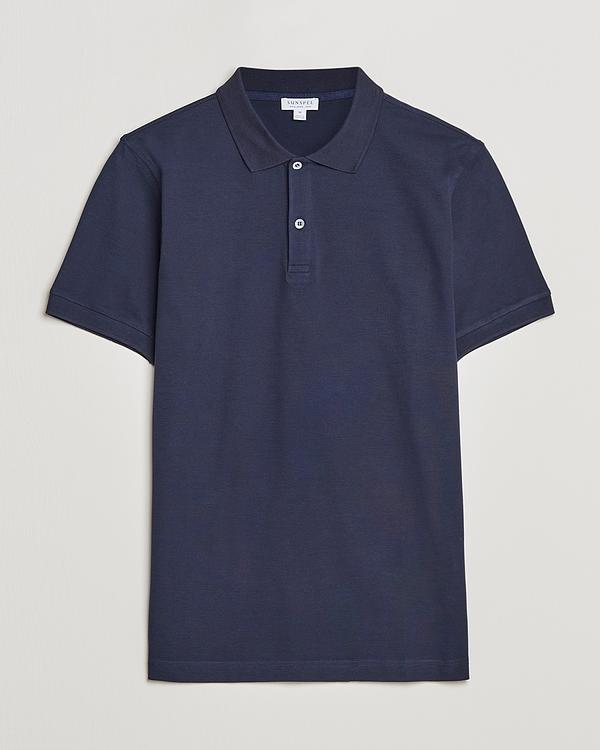 Dark blue short sleeve polo shirt with taupe chinos